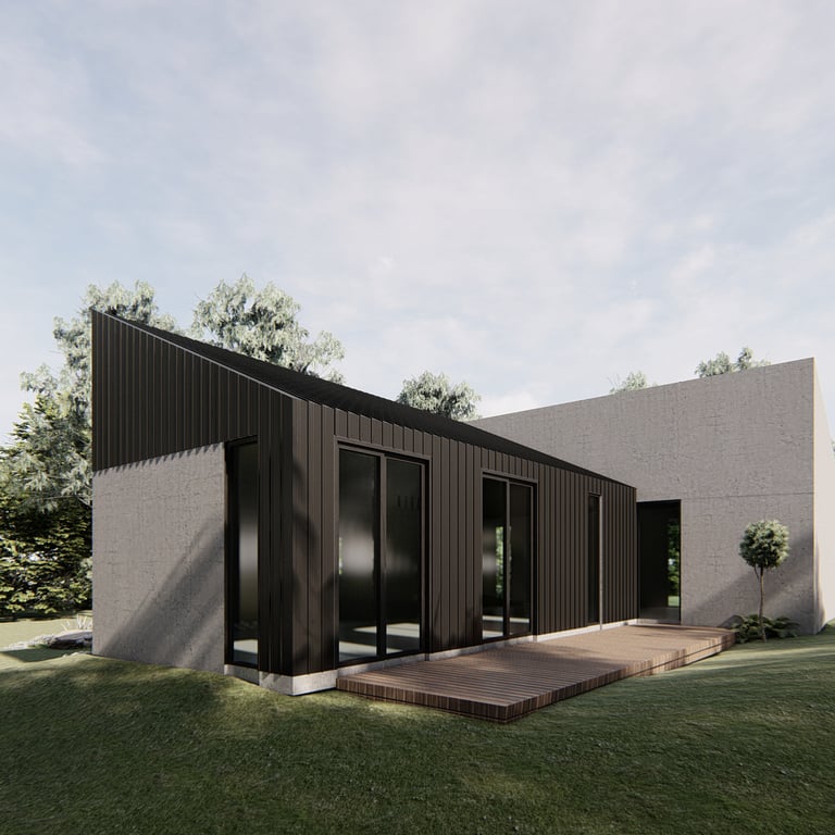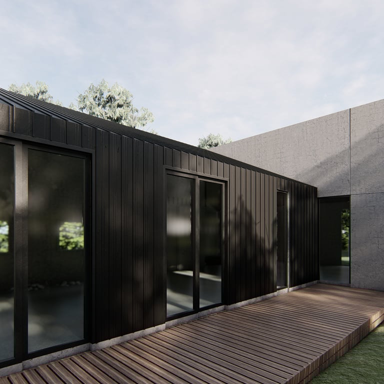 Designed by Buckerfield architects in conjunction Link Builders & Ezi-Rapid Solutions, the homes were developed in response to the Victorian Government's call to 'Design and Construct' a 3 bedroom, single detached house that would be affordable, well-considered in design, innovative, energy efficient (6 star rating) and meet the Bushfire Attack Level (BAL 40) standards.
